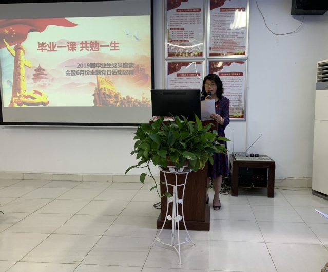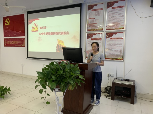 彭敏做总结发言,她对在座毕业生党员顺利完成大学学业、即将开辟出自己的一片天空,走向工作岗位,表示衷心祝贺。并代表学院党总支要求各位毕业生党员始终牢记在党旗下立下的入党誓言,由此提出三点希望:一是秉承校院精神,坚定理想信念。从学校历史的积淀中汲取力量,将个人梦与中国梦紧密结合,把个人的理想追求同党的伟大事业紧密联系在一起,勇挑重担,秉公尽能,在服务和奉献社会中实现人生价值。二是做新时代的“有心有为”之士。新时代必须有新作为,要坚定理想与目标、做坦坦荡荡的君子,踏踏实实做人,勤勤恳恳做事,满怀信心踏入人生新征程。三是“因生而学,因学而生”。学习是生命中永恒的主题。希望每一位优秀的党员将来无论是走向工作第一线,还是选择继续深造,都能不断学习新的知识,不断充实自己。殷切希望在座各位毕业生党员用实际行动去呵护、关爱母校的发展和成长,始终铭记“学高身正,诚毅笃行”的校训精神。