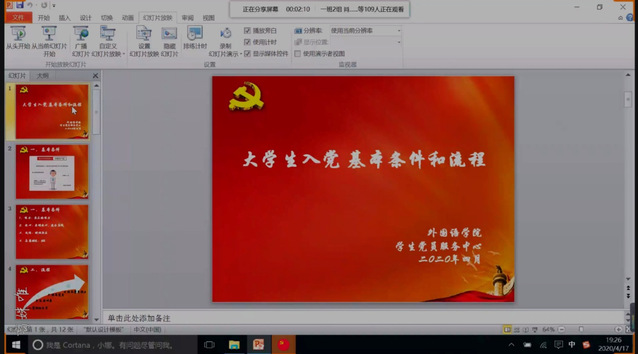本网讯(通讯员:韩一萌)4月17日19点30分,外国语学院分党校第13期入党积极分子培训班在QQ群直播间进行党课学习。本节课由外国语学院学生党员服务中心侯江江同学主持,外国语学院学生党员服务中心高姝唯同学主讲。全体学员139人出席。