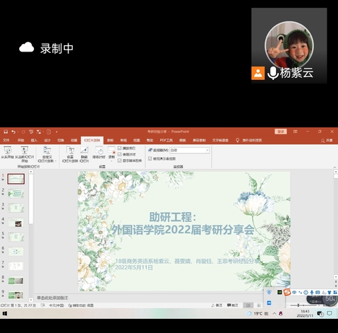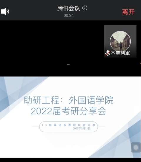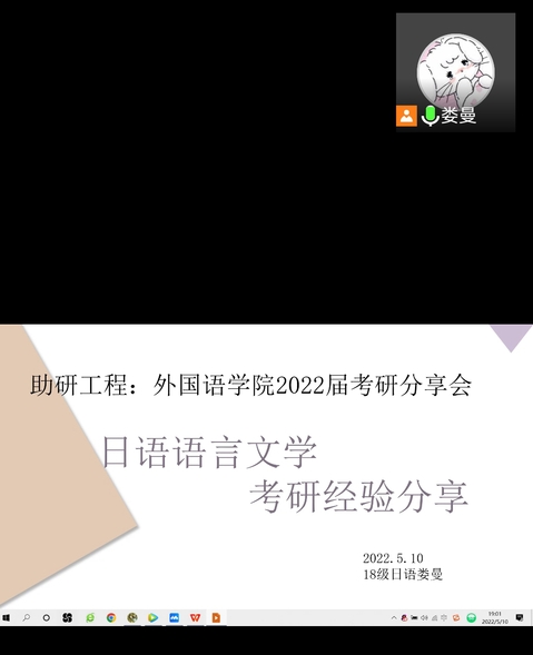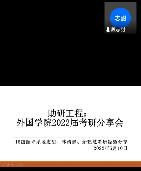 外院网讯(通讯员 吴梦琪)为了让2019级、2020级在校生对考研的“外部世界”有更深入的了解,早日协助在校生规划考研目标,督促其合理开展复习备考工作。5月10日至5月12日晚19点至21点,外国语学院日语专业,翻译专业,商务英语及英语四个专业分别于线上召开“助研工程:2022年毕业生考研分享会”。会议由各专业考研成功的毕业生娄曼、程依静、段志甜、林倩垚、余建慧、杨紫云、聂雯婧、肖璇玉、王菲、田婷、马晓雪、黄译瑶、肖薇等13位依次向参与会议的同学们分享考研经验。
