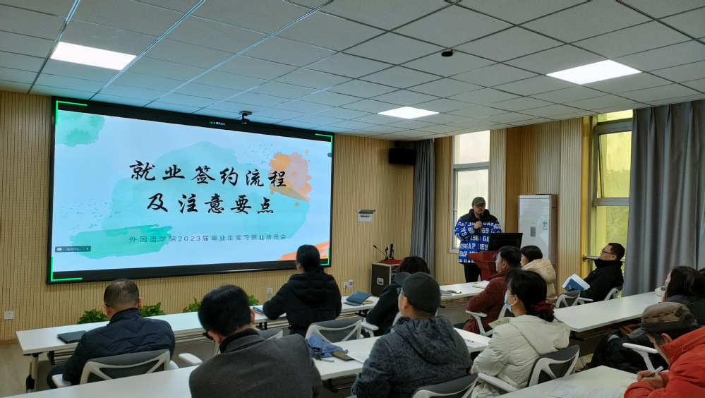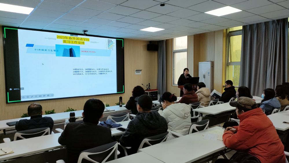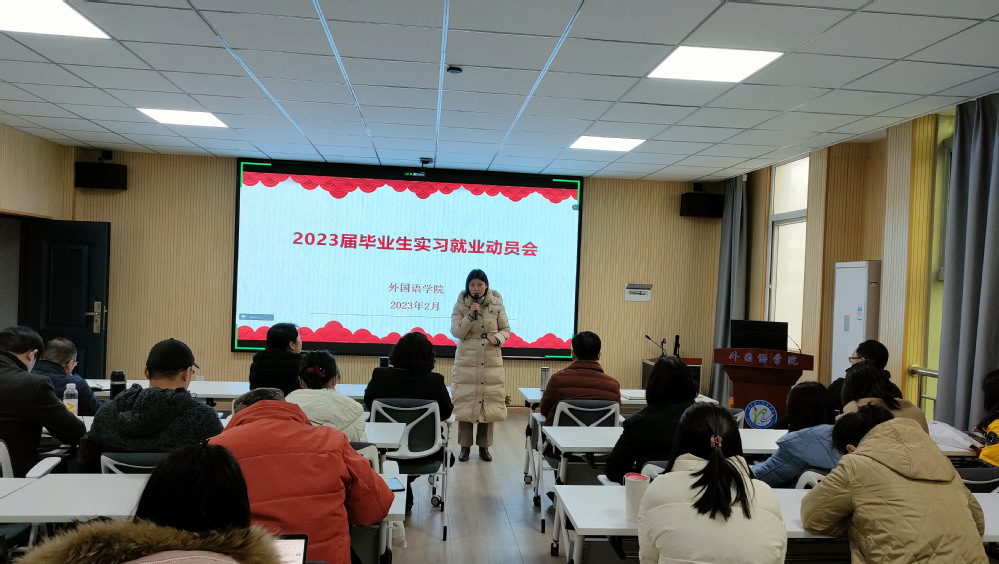 外院网讯(通讯员 王能)2月23日上午,外国语学院在三号楼报告厅召开2023届毕业生实习就业动员会,此次会议采用线上直播的方式同步进行。学院领导班子成员、毕业生辅导员以及全体实习及就业帮扶指导老师、2023届师范生参加会议。学院党委副书记姚勇主持会议。