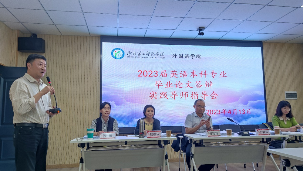 外院网讯(通讯员 梅书晴)4月15日下午,外国语学院2023届英语本科专业毕业论文答辩实践导师指导会在我院三楼报告厅顺利举行。本次答辩委员会由东湖高新区教育发展研究院副院长、特级教师舒晓辉、教发院小学英语教研员魏琐琴、武汉市光谷第六小学教学副校长彭毅君、武汉市光谷第二初级中学英语教研组长李晶、骨干教师钱欢组成,本次答辩会由学院英语系主任陈曦主持。