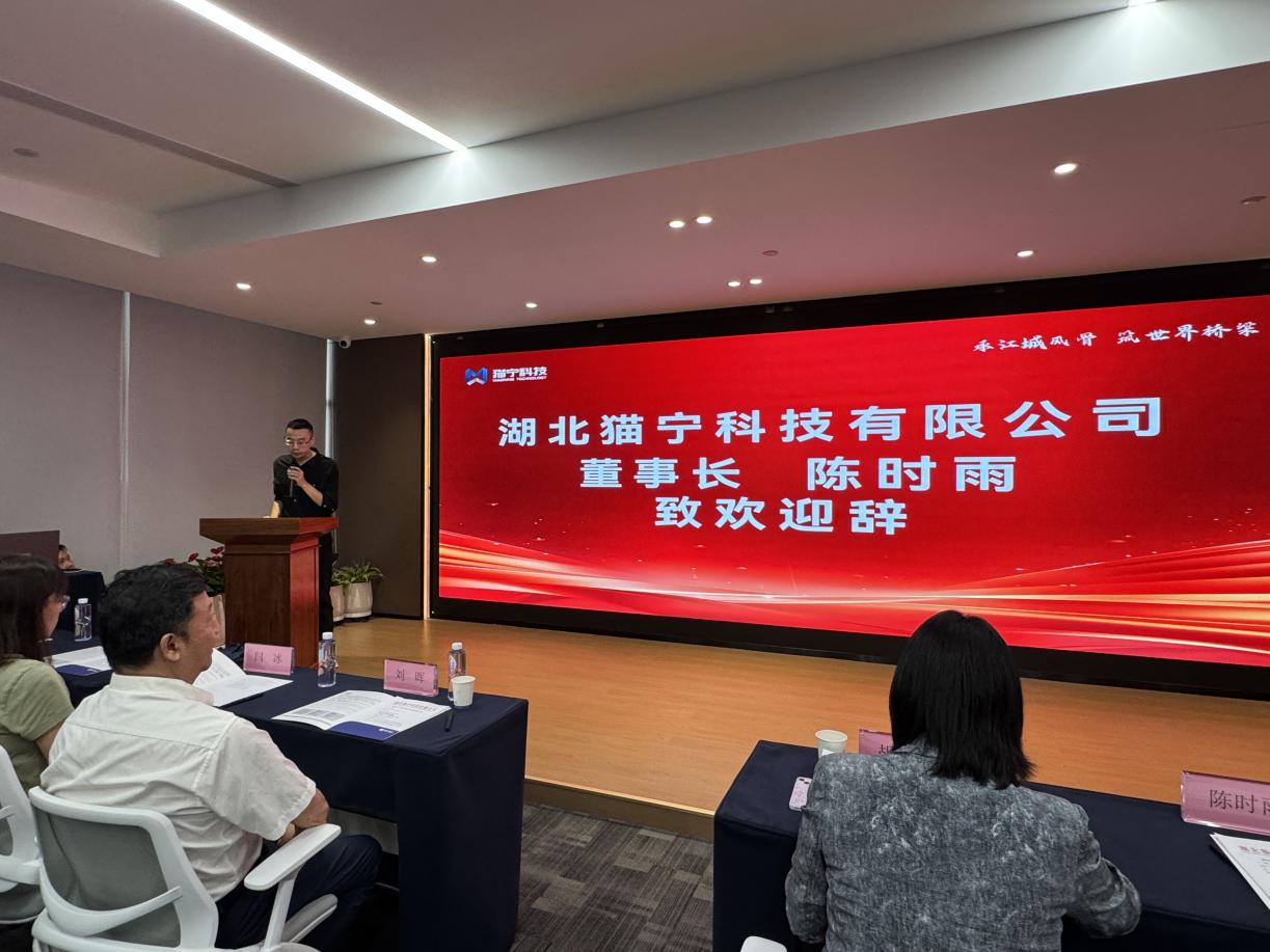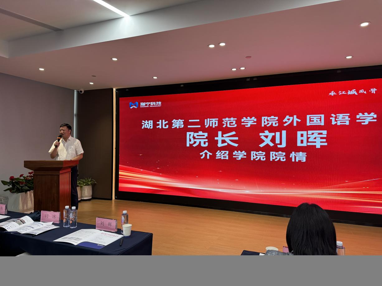 在交流环节,校企双方介绍与会成员,搭建起沟通桥梁。湖北猫宁科技有限公司董事长陈时雨致欢迎辞,表达了对学院来访的热烈欢迎,希望以此次合作为契机,实现资源共享、互利共赢,助力学生完成从校园到职场的对接。外国语学院院长刘晖代表学院对猫宁科技的热情接待表示感谢,并介绍了学校和学院的发展历程,围绕商务英语学科建设、人才培养特色及服务地方产业需求等方面展开阐述,为后续合作明确方向。