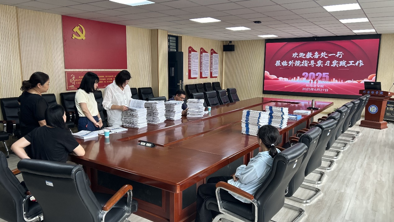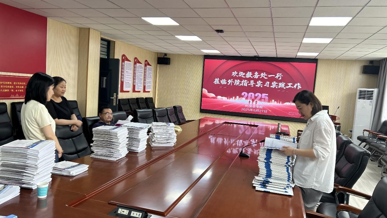 (通讯员 鲁维佳)为进一步提升外国语学院实践教学质量,全面落实实习、见习、研习“三习”全过程管理,积极迎接2026年硕士点达标申报工作,2025年6月27日下午,外国语学院在四楼会议室顺利开展了2025届实习实践相关材料检查工作。本次检查由教务处付璀璨老师、冯媛媛老师莅临检查指导,学院分管实习实践工作的副院长冶慧颖及各系部教研室主任和教师代表共同参与。