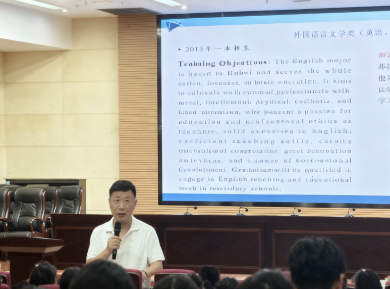 讲座伊始,刘晖院长首先介绍了湖北第二师范学院的英文表述——Hubei University of Education,引导同学们以英语思维融入“湖二师”这个新家园。随后,他系统介绍了我校英语专业的设置背景、培养目标以及课程体系,帮助新生建立专业认知框架。