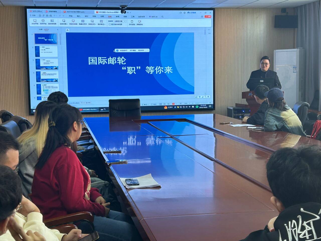 随后,厦门海陆海事服务有限公司武汉分公司副总经理王鹏就公司核心业务展开宣讲。他围绕国际邮轮服务业的基本概念,系统讲解了行业发展现状与前景;同时,针对学子们最关心的岗位设置、薪资待遇、晋升路径等内容进行详细说明,并通过图文展示,生动介绍了邮轮上的工作与生活环境,让同学们对该领域的职业形态有了直观认知。