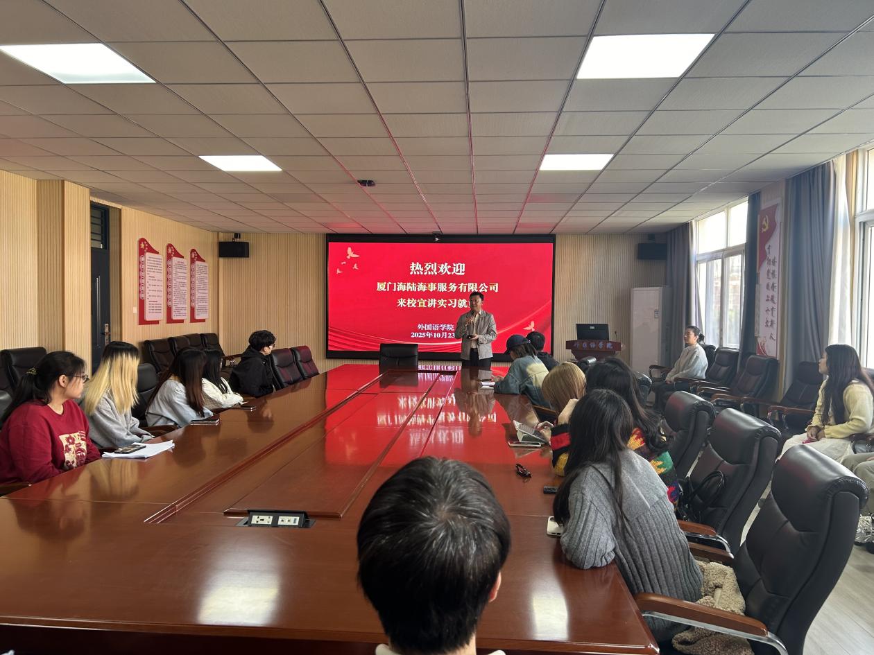 (通讯员:邓卓东)为搭建优质实习就业桥梁,助力外院学子精准就业,10月23日下午,厦门海陆海事服务有限公司走进我院,举办了一场实习就业专场宣讲会,学院学子积极参与,现场氛围热烈。