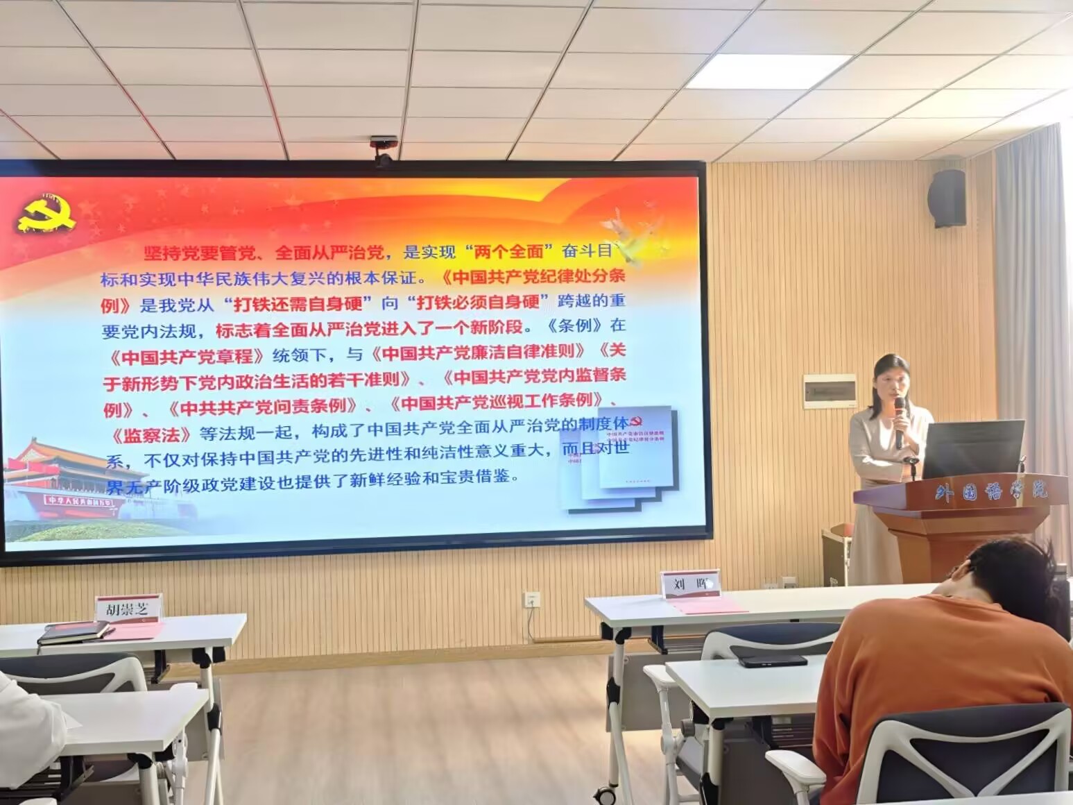 动员结束后,胡崇芝开启本次培训第一讲——《深入学习贯彻<中国共产党纪律处分条例>,争做新时代合格共产党员》。她系统阐释了《条例》的修订背景、主要内容及实践要求,结合青年学生特点,引导学员深刻领会全面从严治党的重大意义,进一步坚定听党话、跟党走的理想信念。