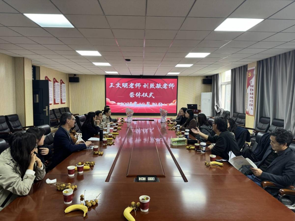 (通讯员:邱辛欣)2025年10月30日中午,商务英语系与翻译系在学院会议室联合举办荣休座谈会,以温馨而庄重的方式向即将退休的刘致敏老师和王文明老师致以崇高敬意与诚挚感谢。两系全体教师齐聚一堂,共同回顾两位老师的执教生涯,畅谈同事情谊,传承教育精神。