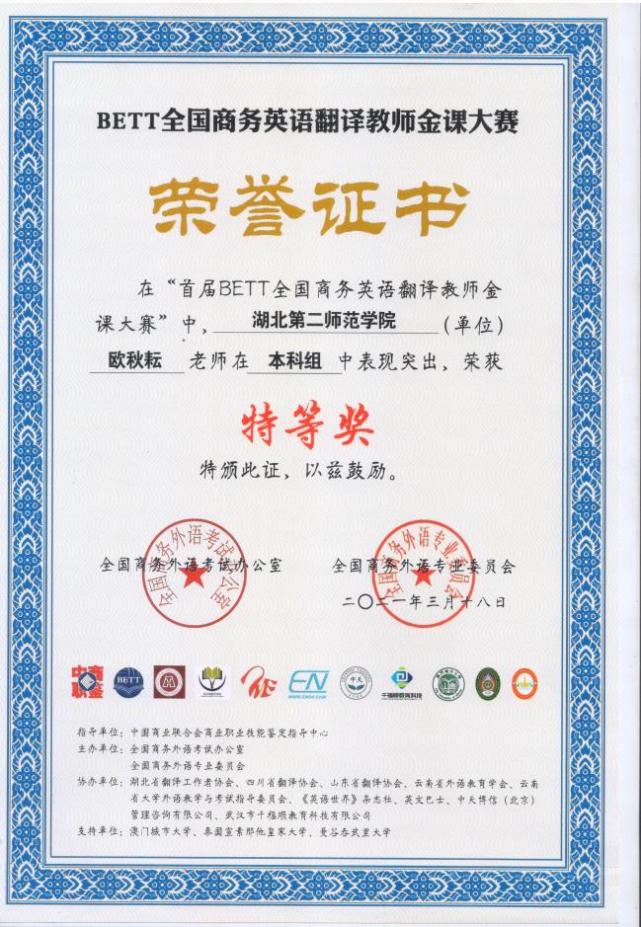 Our faculty has won numerous awards at various levels in teaching competitions: the second prize in the national finals of the “SFLEP Cup” National Foreign Language Teaching Competition for Colleges and Universities; the third prize in the national finals of the FLTRP “Star of Teaching” National Foreign Language Teaching Competition; the grand prize in the “Zhongyu Cup” National “Internet Plus” English Teaching Competition for Colleges and Universities; and the grand prize in the BETT National Business English Translation Teacher “Golden Course” Competition.