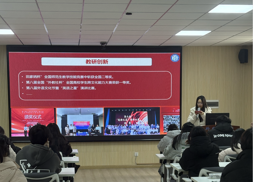 在“专业赋能与责任践行”宣讲环节,宣讲人王晓玥结合学院师范类外语专业特色与过往育人成果,通过多个师生鲜活实践案例,生动呈现了当代外语人在文化传播、教育实践、社会服务等多元场景中的使命担当。教研上,学子在全国师范生技能竞赛、跨文化能力大赛中屡获佳绩,将中国元素融入教学;实践中,双语直播助农、国际交流传扬中国故事;党建引领下,“用英语讲党史”让红色文化跨语言传播,清晰展现外语专业从“信息传递”到“共识构建”、从“语言服务”到“价值沟通”的升级路径。