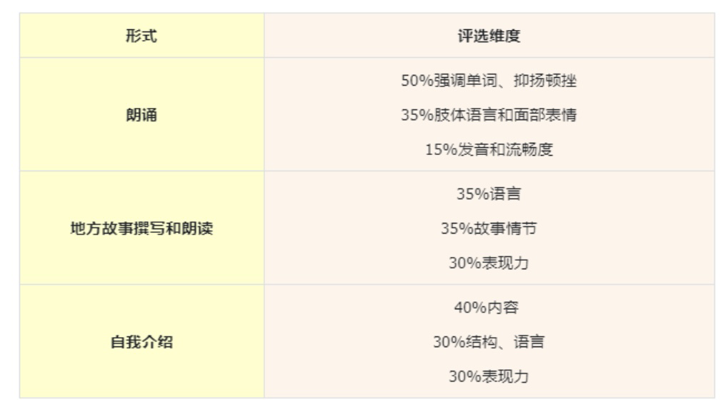 采用1.5分钟自由演讲,选手从“经典故事朗诵”“地方故事撰写”“自我介绍”3种形式中自选1种来准备作品,拍摄视频并上传。