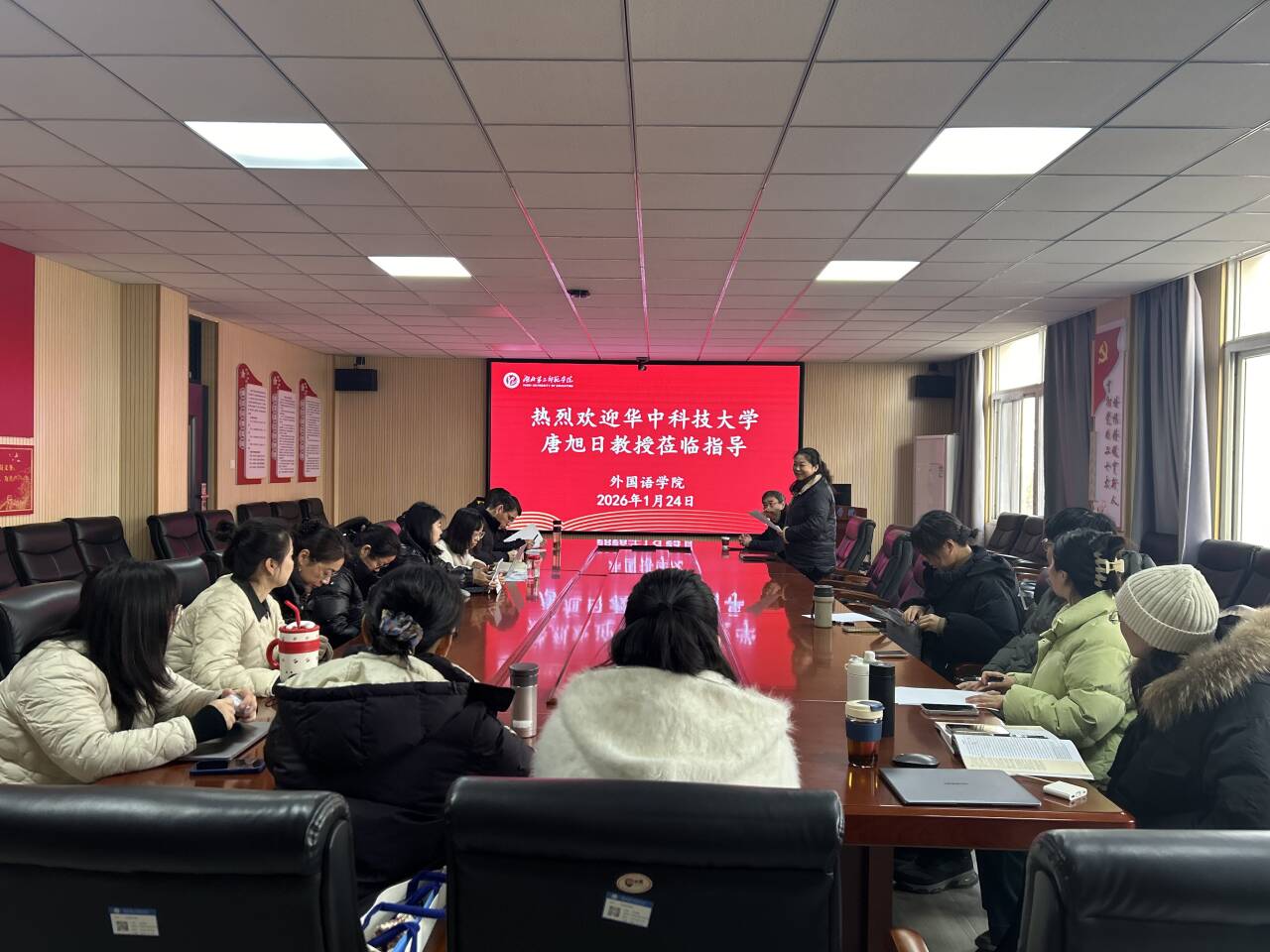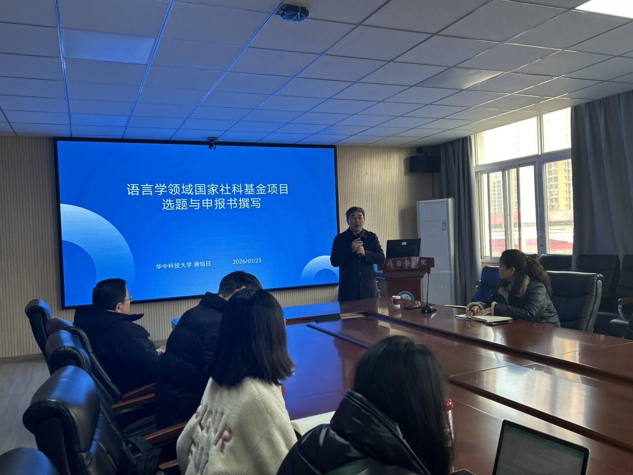 (通讯员:鲁维佳)2026年1月24日上午,外国语学院于学院四楼会议室隆重召开2026年国家级项目申报指导交流会。时值深冬,窗外寒意仍浓,会场内却洋溢着热烈而浓厚的学术氛围。本次会议旨在系统推进新一年国家级科研项目申报工作,切实提升申报质量与竞争力,彰显了学院对科研创新与高层次项目孵化的高度重视。会议特邀华中科技大学外国语学院教授、博士生导师唐旭日莅临指导,学院科研副院长冶慧颖主持会议,全院拟申报国家级项目的教师、博士及青年教师积极参与。