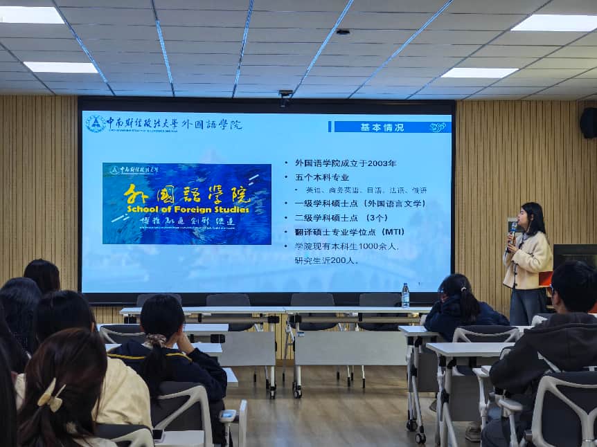 宣讲会上,主讲人结合自身求学经历,首先向同学们展示了中南财经政法大学的校园风貌,让大家直观感受财大的校园环境与学术氛围。随后,围绕外国语学院研究生培养等核心内容展开详细介绍:在研究方向划分方面,徐老师清晰解读了外国语言文学一级学科硕士点、二级学科硕士点及翻译硕士(MTI)专业学位点的培养定位与方向特色;随后又重点介绍了学院雄厚的专家学者队伍与高水平教学科研平台;并就研究生奖助机制及相关政策进行了细致解读,切实解答了同学们关心的学业与生活保障问题。