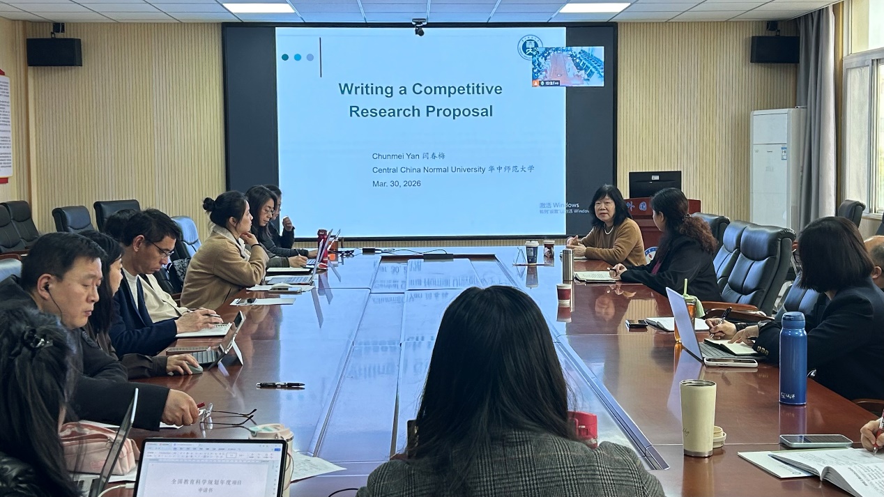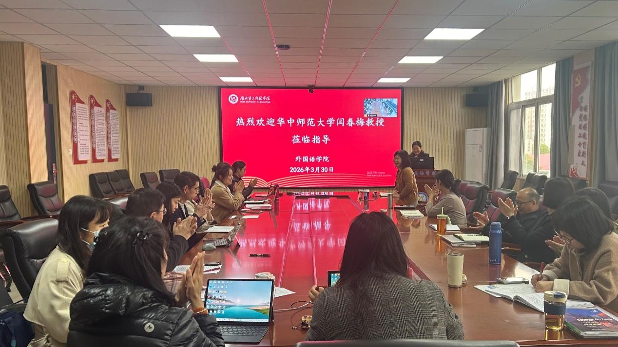 (Correspondent: Lu Weijia) On the afternoon of March 30, 2026, the School of Foreign Languages successfully hosted the Second Lecture in the 2026 National Project Application Guidance Series and the Industry Expert Guidance Meeting for English Major in the Fourth-floor Conference Room. Professor Yan Chunmei, a doctoral supervisor from the School of Foreign Languages at Central China Normal University, was invited as the guest speaker. The event aimed to assist faculty members in enhancing the quality of their national project applications and provide professional guidance and cutting-edge ideas for the development of the English major and the cultivation of teacher education talents. Hu Chongzhi, Secretary of the Party Committee of the School of Foreign Languages, Ye Huiying and Feng Ting, Vice Deans, as well as teachers from the national project application team, members of research platforms and all faculty of the English Department attended the lecture. The lecture was presided by Vice Dean Ye Huiying and conducted both online and offline simultaneously.